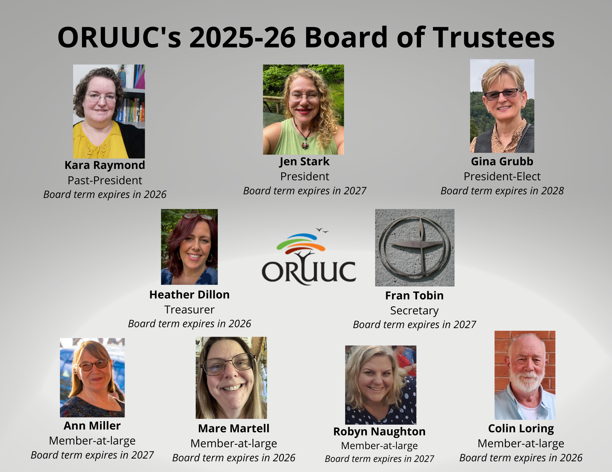 On the first Sunday of each month, a board member will be available in the lobby/portico during second hour for conversations. To contact the Board, email President@oruuc.org.